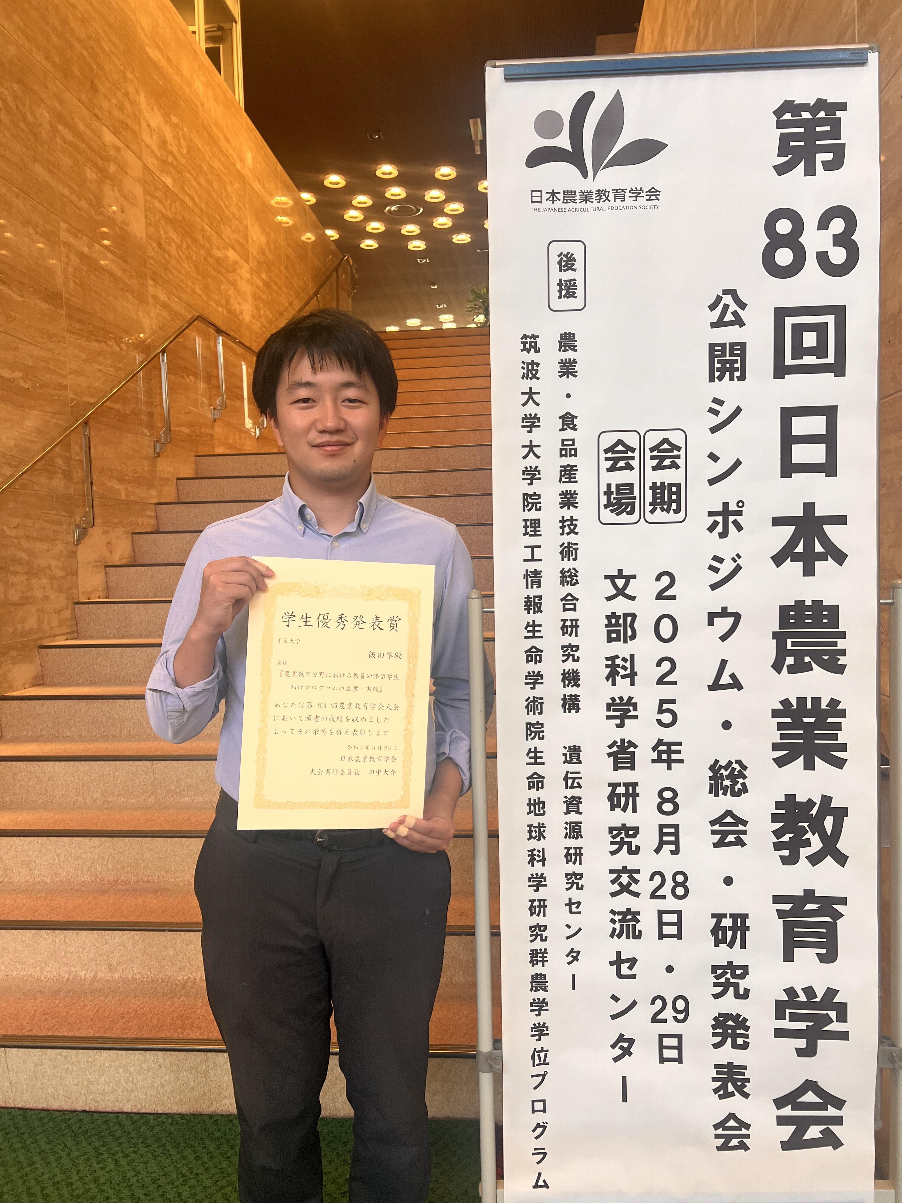 2025年8月28日~29日開催の第83回日本農業教育学会で、教育学研究科(技術科)の飯田隼さんが「学生優秀発表賞」を受賞しました。演題は「農業教育分野における教員研修留学生制度の活用~グローバル人材養成に資する活動モデルの検討~」です。高校農業科での授業・行事に、教員研修留学生が通年で参加することによる、高校と教員研修留学生双方への効果を検証しました。
