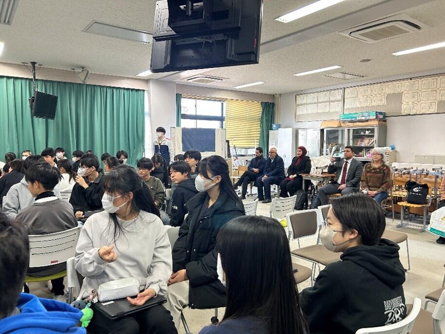 2025年12月12日(金)、イラクのバクダード大学及びムスタンシリア大学の教員、研究者や学生らが日本式教育導入の参考とするため、教育学部附属中学校の視察に訪れました。異学年交流の「English Festival !」や生成AIを活用した授業を参観後、附属中学校の行事や生徒会活動、道徳教育についての説明に対して、熱心な質疑応答が行われました。